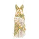 Become the vision of effortless romance. This isn't just a dress; it's the feeling of a sun-warmed garden party, the confidence of being the best-dressed guest, the memory of a perfect summer evening. Imagine the whisper of delicate French lace against your skin as you move, the silky-soft floral fabric cascading in asymmetrical ruffles that dance with every step. The plunging V-neck and daring open back, secured by a delicate tie, create a silhouette that is both ethereal and captivating. This is your moment to embody grace and modern femininity.