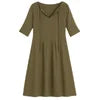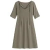 A-line silhouette', 'tie-neck gown', 'bohemian chic dress', 'vacation wear', 'comfortable elegant dress', and 'lightweight travel dress
