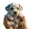 Close-up view of a lifelike electronic Dalmatian puppy being held in two hands, highlighting the realistic spotted fur texture, expressive eyes, and high-quality craftsmanship.