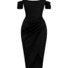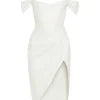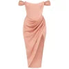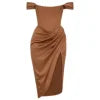 The moment you enter, the room stills. It’s not just the dress; it’s the way you command attention in it. Crafted from a lustrous, liquid-like mocha satin, this dress isn't merely worn—it's experienced. Feel the structured corset bodice sculpt your silhouette, creating an hourglass figure of classic elegance and modern sensuality. The off-the-shoulder Bardot neckline frames your collarbones with a sophisticated allure, while the masterfully draped skirt cascades across your hips, culminating in a daring yet graceful thigh-high slit that reveals just enough with every step. This is your armor for the unforgettable nights, the celebrations, the moments you are the main event.