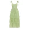 Float into your next grand occasion in a dress that feels like a waking dream. This is not merely an outfit; it is your transformation. Picture the soft whisper of four cascading tiers of ethereal sage tulle as you move, catching the golden hour light and turning every head in the room. The delicate, hand-tied shoulder bows kiss your skin, a soft detail that invites a second glance. Feel the structured, ruched corset bodice gently contour your form, creating a timeless, impossibly romantic silhouette that radiates confidence and grace. This is the dress for the unforgettable moments: the clinking of champagne glasses, the shared laughter under fairy lights, the stolen glances across a crowded room. You are not just attending the event; you are the main character in a modern fairytale.
